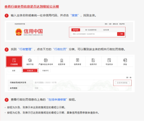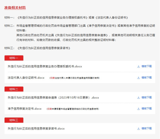 如果您在“信用中國”網站上查詢到您企業發生了失信行為,可以按照以上流程進行信用修復,信用修復前請提前進入流程指引網址,點擊第二步下載準備材料模板。