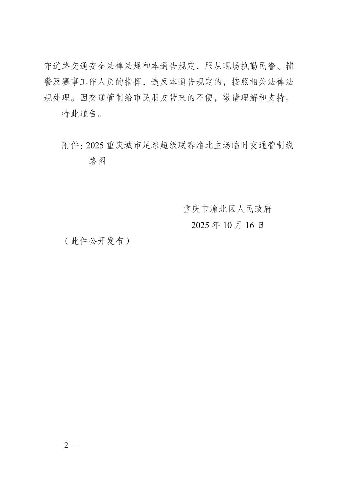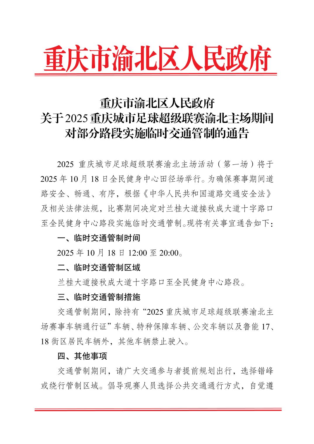 重慶市渝北區人民政府關于2025重慶城市足球超級聯賽渝北主場期間對部分路段實施臨時交通管制的通告