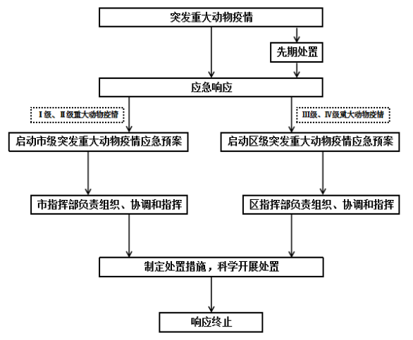 發(fā)生或可能發(fā)生Ⅰ級重大動物疫情時,由市指揮部啟動Ⅰ級應急響應。