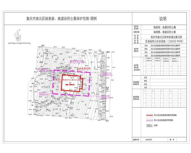 保護范圍:東以烈士紀念設施實際使用范圍外堡坎圍墻為界;南以烈士紀念設施實際使用范圍外大樹內側為界;西以烈士紀念設施實際使用范圍外堡坎內為界;北以烈士紀念設施實際使用范圍外堡坎為界。
