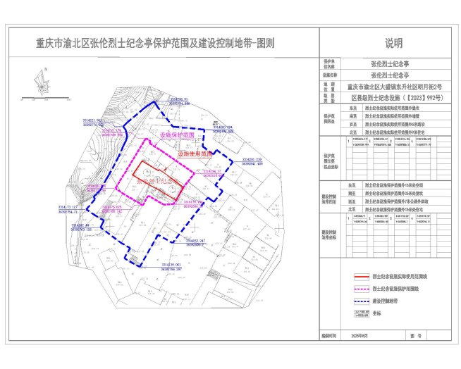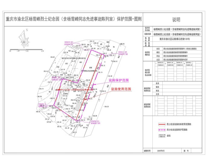 保護范圍:東以烈士紀念設施實際使用范圍外28米處景觀樹內側為界,南以烈士紀念設施實際使用范圍外9米綠化為界,西以烈士紀念設施實際使用范圍場地邊沿為界,北至烈士紀念設施實際使用范圍外6米堡坎為界。