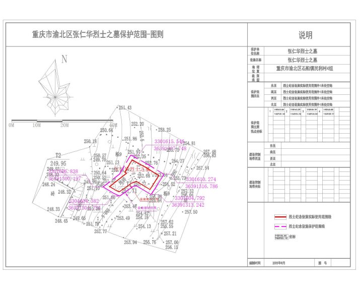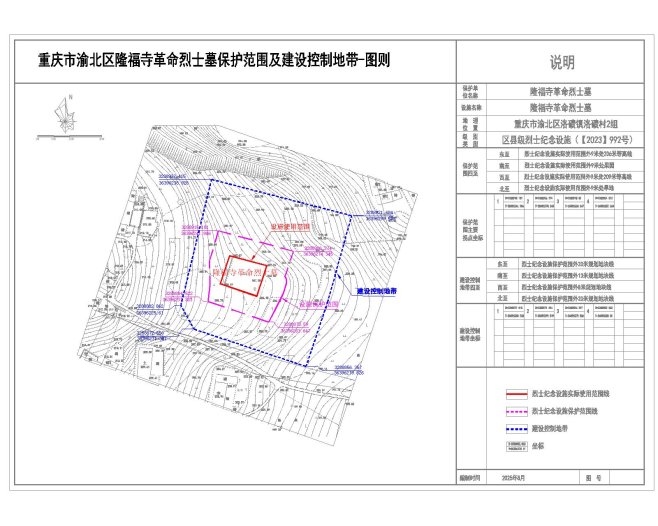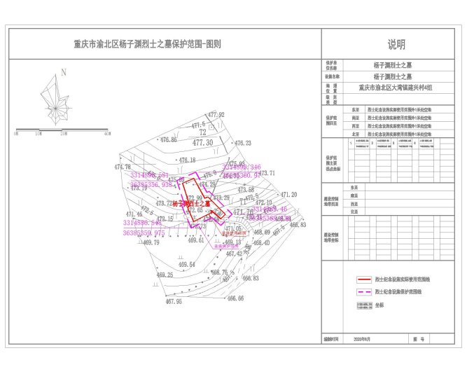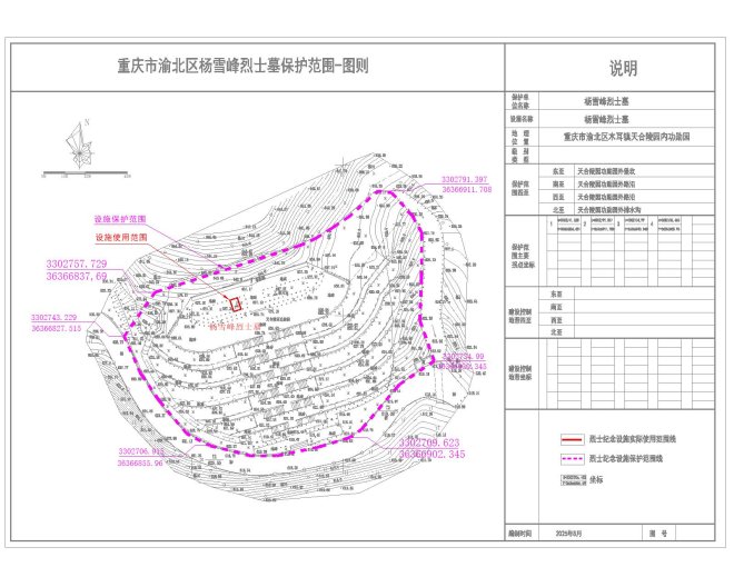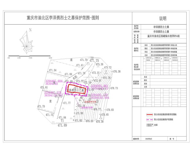 保護范圍:東以烈士紀念設施實際使用范圍外9米處206米等高線為界;南以烈士紀念設施實際使用范圍外9米處果園為界;西以烈士紀念設施實際使用范圍外9米處209米等高線為界;北以烈士紀念設施實際使用范圍外9米處旱地為界。